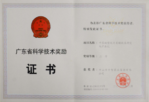 2013年獲廣東省科技進(jìn)步二等獎(中藥破壁飲片關(guān)鍵技術(shù)研究與產(chǎn)業(yè)化);