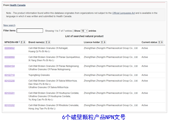 中藥破壁飲片NPN文號(加拿大衛(wèi)生部官網(wǎng))