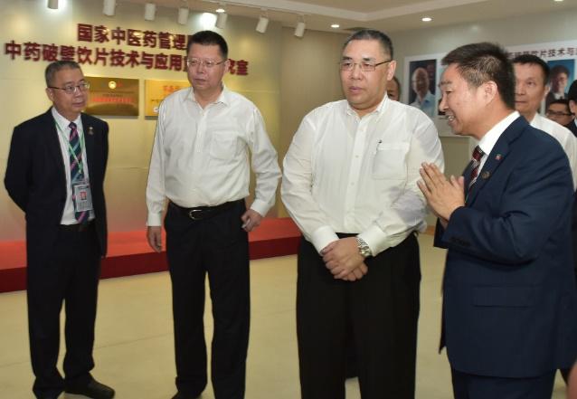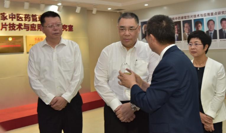圖說(shuō):中智藥業(yè)總工程師成金樂(lè)教授向澳門特首崔世安(右二)、中山市長(zhǎng)焦蘭生(右三)一行介紹新型中藥破壁飲片。