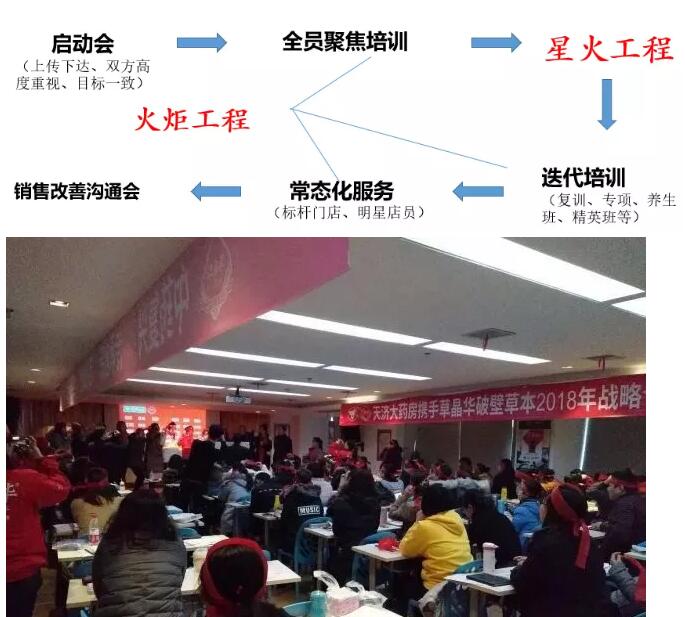在具體實(shí)踐中,草晶華透過“兩會(huì)兩工程”實(shí)現(xiàn)營銷在合作連鎖的落地——“兩會(huì)”,一是指啟動(dòng)會(huì),意在與合作藥店實(shí)現(xiàn)目標(biāo)的共同建立,透過項(xiàng)目開展的意義與儀式感提升團(tuán)隊(duì)的認(rèn)知及行動(dòng)力;二是指銷售改善會(huì),每月一次,雙方關(guān)鍵團(tuán)隊(duì)成員就合作中的問題與亮點(diǎn)深度交流,定出問題改善策略與動(dòng)作,快速糾偏?!皟晒こ獭?,一是指火炬工程,強(qiáng)調(diào)知識(shí)的傳播,要求培訓(xùn)體系(三級培訓(xùn),分層級迭代打造員工專業(yè)化,形式包括全員基礎(chǔ)培訓(xùn)、區(qū)域復(fù)訓(xùn)、門店貼柜培訓(xùn)、精英班、養(yǎng)生專家班等)按月、按季、按區(qū)域開展;二是指星火工程,強(qiáng)調(diào)技能的轉(zhuǎn)化,即總部動(dòng)銷師與屬地動(dòng)銷師要到門店手把手教會(huì)店員銷售,同時(shí)實(shí)現(xiàn)門店每天超出之前5至10倍的銷售增長。