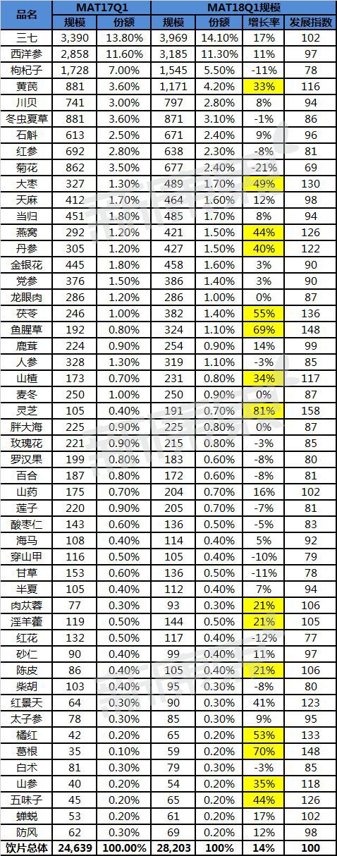 據(jù)中康CMH監(jiān)測(cè)的最新數(shù)據(jù)顯示,2018年第一季度,中藥飲片銷(xiāo)售前五的品種為三七、西洋參、枸杞子、黃芪、川貝,其中三七、西洋參、黃芪三個(gè)品種的銷(xiāo)售額快速增長(zhǎng),均高達(dá)兩位數(shù)。