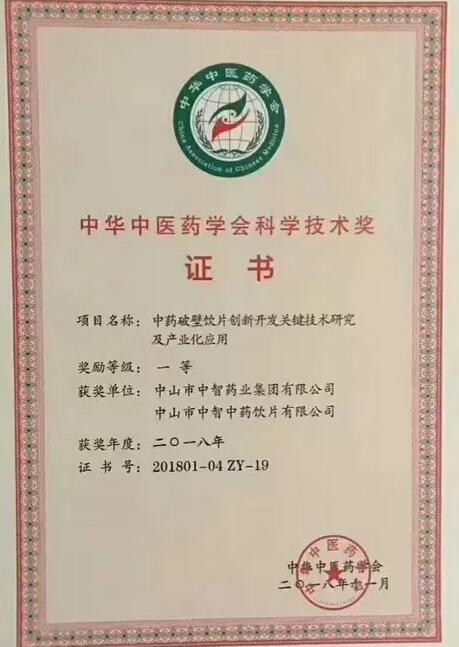 11月25日,中山市中智藥業(yè)集團(tuán)有限公司申報(bào)的“中藥破壁飲片創(chuàng)新開發(fā)關(guān)鍵技術(shù)研究及產(chǎn)業(yè)化應(yīng)用”項(xiàng)目,榮獲2018年度中華中醫(yī)藥學(xué)會(huì)科學(xué)技術(shù)獎(jiǎng)一等獎(jiǎng)。