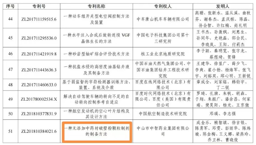2022年7月22日,國家知識產(chǎn)權(quán)局發(fā)布第二十三屆中國專利獎授獎決定,廣東省創(chuàng)新中藥企業(yè)中智藥業(yè)集團(tuán)“一種無添加中藥材破壁粉顆粒制劑的制備方法”發(fā)明專利,獲得本屆中國專利銀獎。