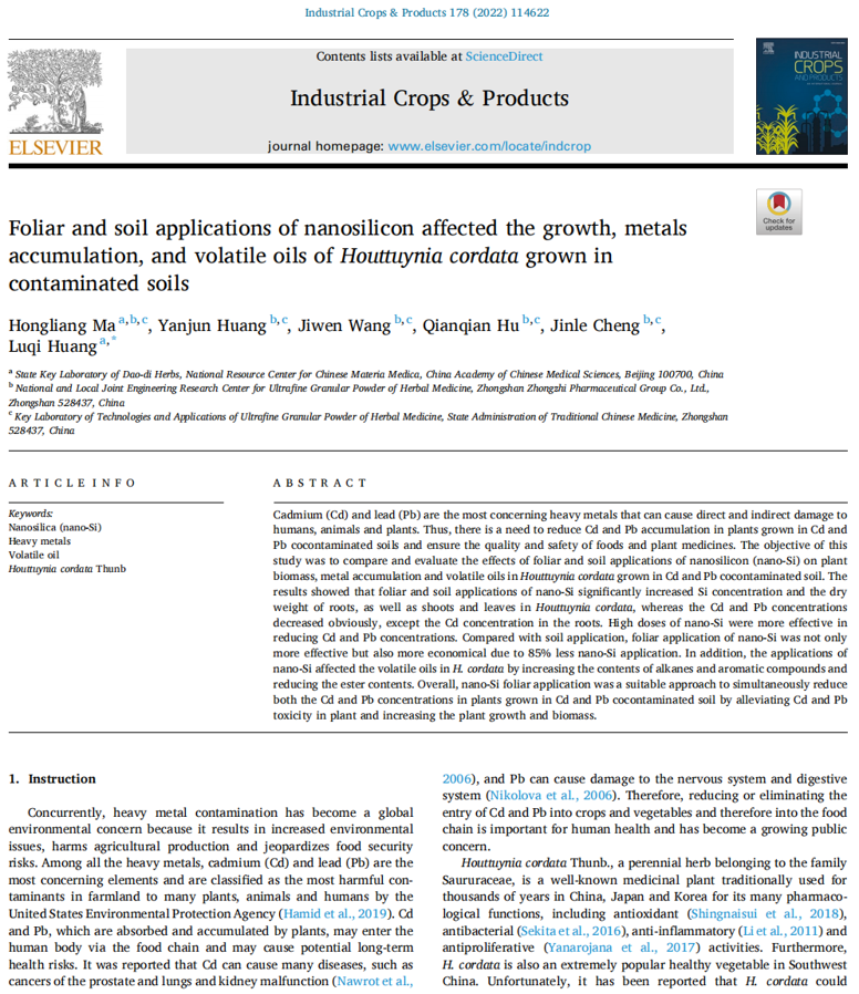 近日,草晶華中藥資源開(kāi)發(fā)與研究中心馬宏亮博士研究團(tuán)隊(duì)與中國(guó)中醫(yī)科學(xué)院黃璐琦院士研究團(tuán)隊(duì)合作項(xiàng)目研究成果科研論文《Foliar and soil applications of nanosilicon affected the growth, metals accumulation, and volatile oils of Houttuynia cordata grown in contaminated soils》,在國(guó)際著名學(xué)術(shù)期刊IndustrialCrops & Products上發(fā)表,標(biāo)志著草晶華魚(yú)腥草生產(chǎn)及質(zhì)量控制水平獲得國(guó)際認(rèn)可!