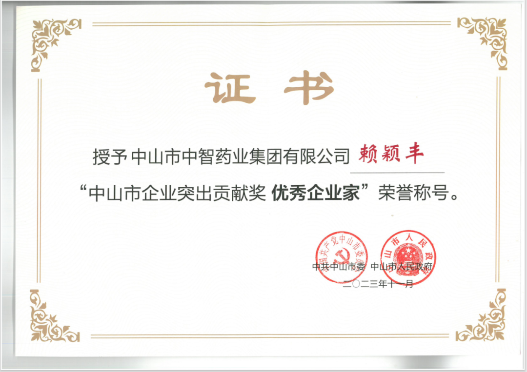11月1日,中山市委、市政府舉辦中山市第二屆“企業(yè)家日”活動(dòng),召開企業(yè)家表彰大會(huì),隆重表彰2022年度為中山市經(jīng)濟(jì)發(fā)展做出突出貢獻(xiàn)的企業(yè)和企業(yè)家。廣東省創(chuàng)新中藥企業(yè)中智藥業(yè)集團(tuán)總裁賴穎豐,獲“中山市企業(yè)突出貢獻(xiàn)獎(jiǎng)優(yōu)秀企業(yè)家”榮譽(yù)表彰。