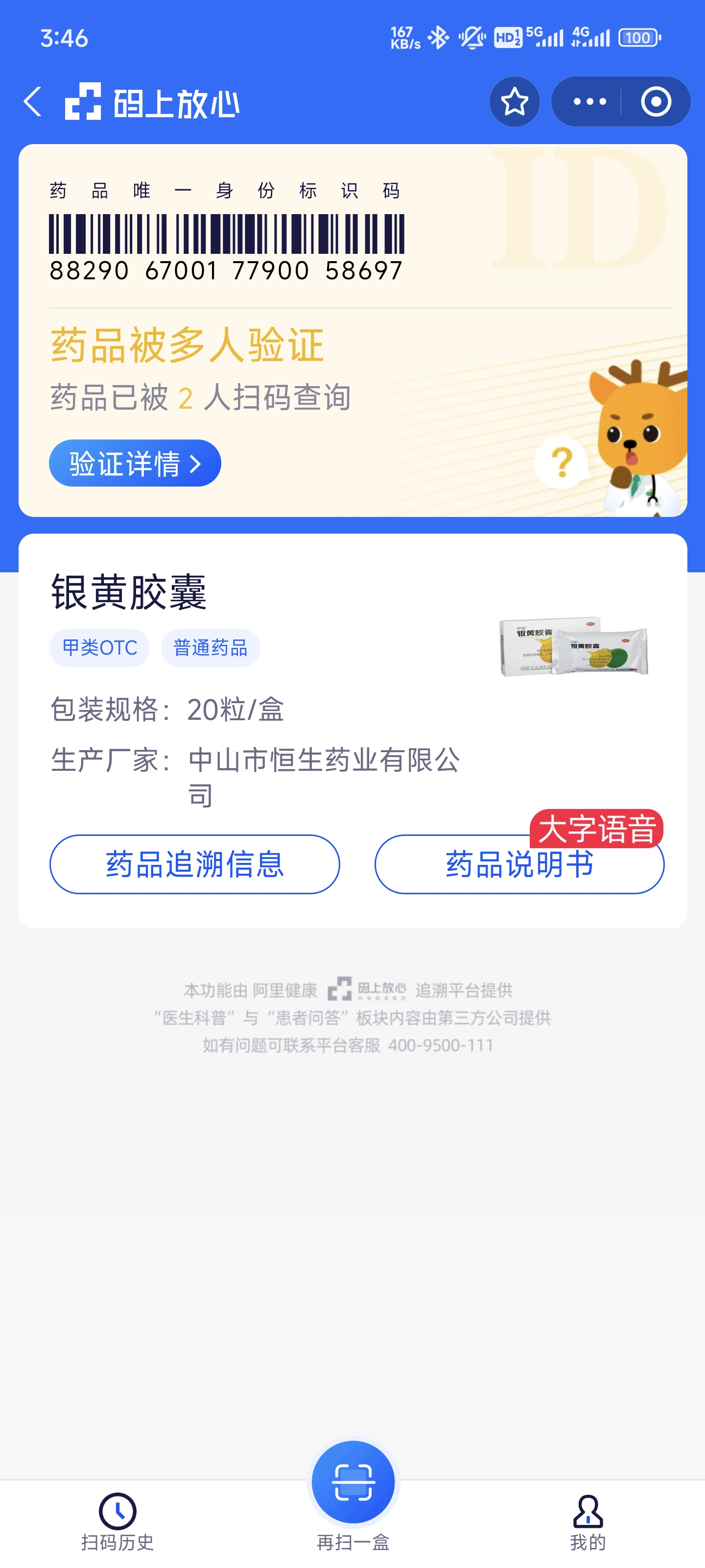 為進(jìn)一步方便顧客使用,我司同時(shí)采取“在藥品追溯碼系統(tǒng)中更換修訂后的說明書”的方式告知顧客,顧客只需按掃碼查詢的方式,即可獲取修訂后的銀黃顆粒說明書,不會(huì)影響藥品正常使用。