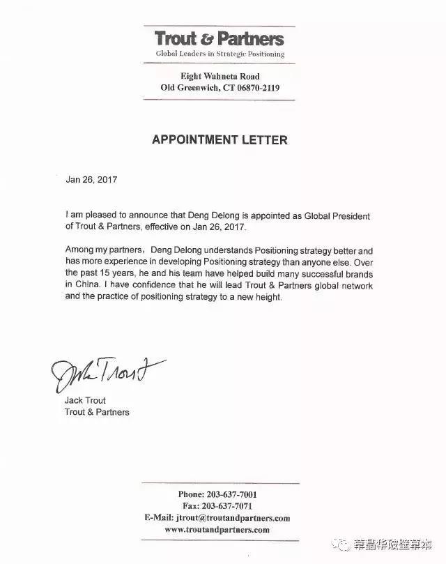 杰克?特勞特先生在任命函中表示:“在我全球眾多合伙人當(dāng)中,鄧德隆先生對(duì)定位戰(zhàn)略的理解以及發(fā)展定位戰(zhàn)略的經(jīng)驗(yàn)上都是最優(yōu)秀的。在過去的5年中,他和他的團(tuán)隊(duì)協(xié)助客戶在中國(guó)建立了眾多成功品牌。我相信,在他的帶領(lǐng)下,特勞特伙伴公司全球網(wǎng)絡(luò)的發(fā)展以及定位戰(zhàn)略的實(shí)踐將達(dá)到一個(gè)新的高度。”