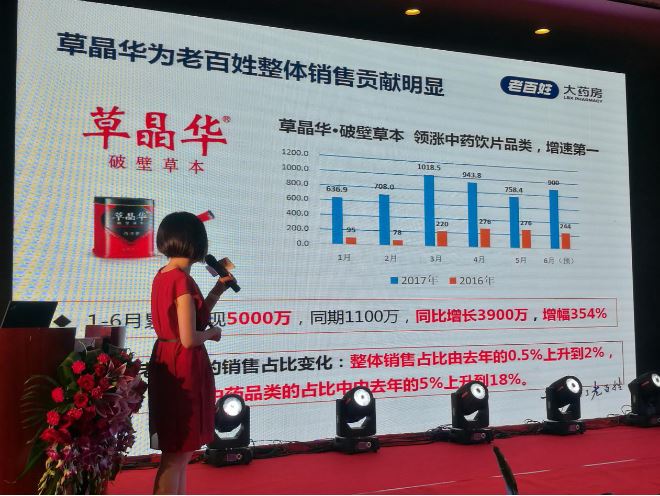創(chuàng)新品類草晶華破壁草本已形成熱銷勢能。王黎用數(shù)據(jù)說話,她說:草晶華因其質(zhì)量優(yōu)勢、技術(shù)優(yōu)勢、運(yùn)營優(yōu)勢,成為領(lǐng)漲中藥飲片品類增速第一的創(chuàng)新品類。2016年11月18日,老百姓大藥房執(zhí)行總裁馮硯祖率領(lǐng)高管團(tuán)隊(duì)走進(jìn)中智藥業(yè),與草晶華簽訂了2017年2億元的戰(zhàn)略合作,一起構(gòu)建共榮共生的渠道價值鏈。2017年草晶華破壁草本為老百姓整體銷售貢獻(xiàn)明顯,前6個月累計銷售增幅354%,事實(shí)證明,草晶華的熱銷勢能,在未來將越來越大。