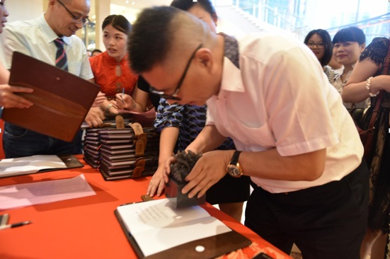 還記得排隊是為了什么嗎?謎底可以揭開了,原來——大家長出手送神秘禮品啦。且看一襲白衣、精神抖擻的大家長,雙手握一玉石大印,大有一印在手、天下我有之氣概。隨著隊伍前移,他手起印落,在牛皮封的筆記本上留下紅泥墨寶。這可是大家長的“墨寶”哦,四方大印刻下的大家長的名字,留存在時光中,溫暖人心。